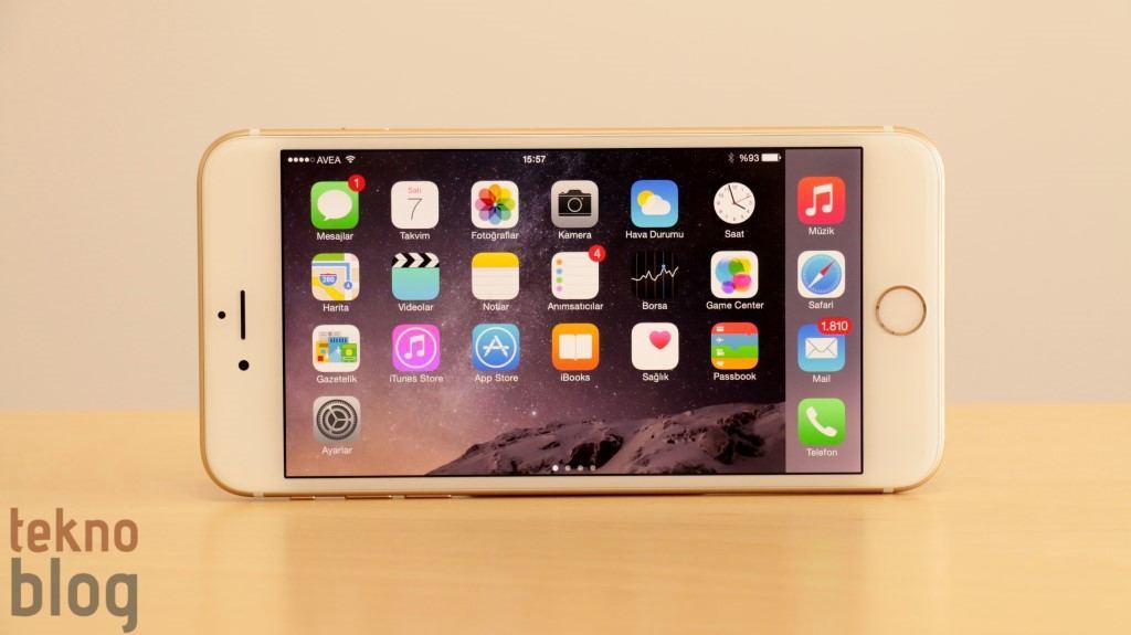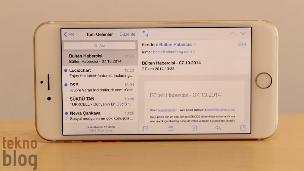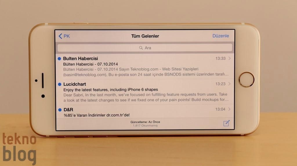 iPhone 6 Plus’ın iPhone 6’dan ayrıldığı en önemli noktalardan bir tanesi de ana ekranın da cihazla birlikte dönmesi, yatay yön için özel bir gösterim modunun bulunması. iPhone 6 Plus bu yönüyle kullanıcılara biraz iPad deneyimi sunuyor. iPhone 6 Plus’ı yatay yönde kullandığınızda sabit kısayolların bulunduğu tepsi kenara gidiyor, kısayollar yatay eksende sıralanıyor. Öte yandan çeşitli uygulamalar da yatay yönde kullanıma göre dizilişte değişikliklerde bulunuyor. Örneğin Mail uygulamasını yatayda kullandığınızda, tıpkı iPad veya iPad mini’de olduğu gibi, gelen kutusundaki iletilerin listesi ekranın kenarında gösteriliyor. İleti detayı da onun yanında ve daha geniş alan kaplayan bölümde gösteriliyor.