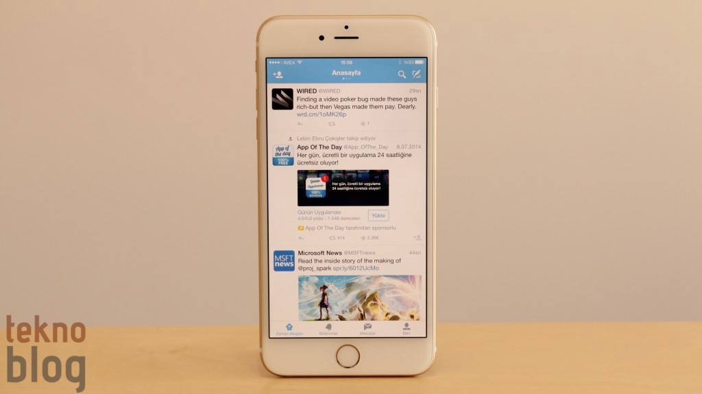 iPhone 6 incelemesinde de söylediğimiz gibi, uygulamaların iPhone 6 Plus’ın ekranında en iyi şekilde görüntülenebilmesi için bu ekran büyüklüğüne ve çözünürlüğe göre optimize edilmesi gerekiyor. Aksi takdirde uygulamalar büyütülmüş mod görünümünde, olması gerektiğinden daha düşük kalitede ve epey büyük yazılarla gösteriliyor. Facebook, Instagram, Feedly gibi uygulamalar bu incelemeyi yazdığımız sırada henüz optimize edilmemişler sınıfı içerisinde yer alıyordu. Apple’ın uygulamaları dışında Twitter, Evernote, Chrome, Gmail ve benzeri üçüncü taraf uygulamalar ise iPhone 6 ve iPhone 6 Plus’ın ekranlarına uyum sağlamış durumda ve bu uygulamaları kullanmak daha fazla zevk veriyor.