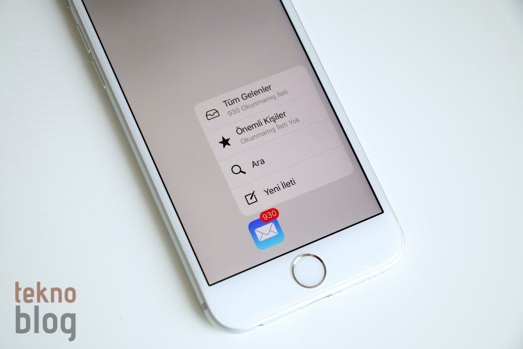 Apple’ın 3D Touch teknolojisinden arayüzün çeşitli bölümlerinde yararlandığını görüyoruz. Öncelikle şirket Peek ve Pop adında iki farklı komut geliştirmiş. Örneğin Mail uygulamasını açtınız ve gelen kutunuzdaki iletilere liste hâlinde bakıyorsunuz. Herhangi bir iletiyi seçip ekrana bastırdığınızda o iletinin ön izleme görünümü açılıyor. Bunun adı Peek. Parmağınızı çekmeden yukarı sürüklediğinizde hızlı işlem yapmayı sağlayan çeşitli komutlar ekrana getiriliyor. İleti ön izleme penceresinde parmağınızı biraz daha bastırdığınızda bu sefer Pop hareketini gerçekleştiriyorsunuz, böylelikle iletinin tam görünümü ekranda açılıyor.