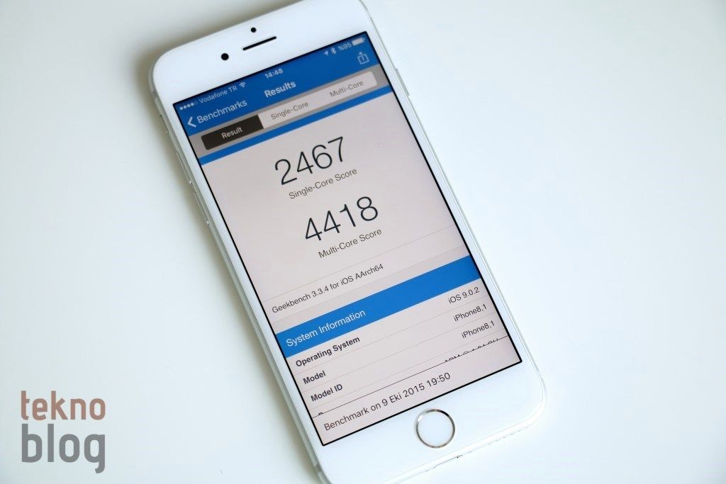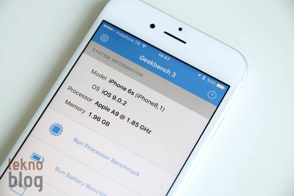 Sonuç olarak donanımdaki artırımlar iOS 9’un iyileştirilmiş ve arka planı daha sağlam hâle getirilmiş yapısıyla buluştuğunda ortaya gerçekten çok yüksek performans çıkıyor. iPhone 6s’i elinize alıp kullanmaya başladığınızda iOS 9’un uçtuğunu fark edeceksiniz. Ana ekran sayfaları arasında geçiş çok hızlı, Spotlight hemen açılıyor, çoklu görev ekranı ana ekran tuşuna iki kez art arda basıldığı anda hızlıca açılıyor. Safari’de sekmelerin genel görünümüne geçmek istediğinizde beklemiyorsunuz, açık sekmelerin kartları da akıyor. Uygulamalar ve oyunlar hızlı şekilde yükleniyor. Bütün bunlar gerçekleştirdiğimiz GeekBench 3 benchmark testinin sonuçlarıyla da ortaya konuyor. iPhone 6s selefine gerçekten dikkate değer bir oranda fark atıyor.
