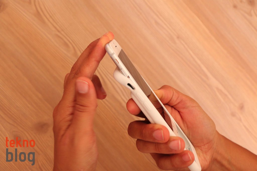 Smart Battery Case ile kullanımda iPhone 6s’in altındaki elemanlar erişilemez hâle geldiği için, Smart Battery Case üzerinde bunların her biri için yedekler oluşturulmuş. Mikrofon ve hoparlör ön yüzde, kullanıcıya bakıyor. Hoparlörün öne yerleştirilmesi bir şeyler izlerken veya dinlerken sesin doğrudan size yönelmesini sağlıyor ve biraz da ses performansını iyileştiriyor. Alt kısımda Lightning portu ve 3.5 mm. kulaklık jakı var. Kulaklık jakı biraz derinde kaldığı için, Apple’ın Earpods kulaklıkları dışındaki kulaklıklar kullanmak biraz zorlanıyor. Örneğin elimde bulunan ve ses performanslarından epey memnun kaldığım iki farklı kulaklığı ne yazık ki, iPhone 6s’e Smart Battery Case giydirilmişken kullanamıyorum. Telefonun kendi kulaklıklarını taşımam gerekiyor.