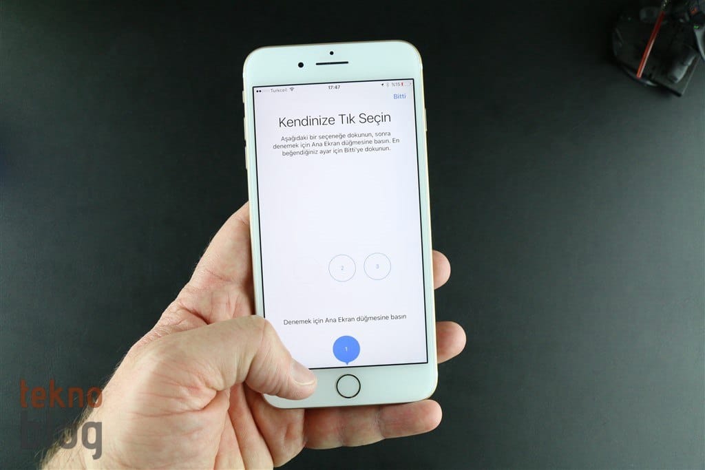 iPhone 7 ve iPhone 7 Plus’ın önemli yeniliklerinden bir tanesi de Ana Ekran butonu. Apple’ın iOS cihazlarının simgesi hâline gelen bu tuş, birkaç yıl önce eklenen Touch ID parmak izi okuyucusundan sonra 2016 model telefonlarla birlikte önemli bir değişiklik geçiriyor. Eski tuşlar gibi basıldığında içeri doğru hareket etmeyen yeni Ana Ekran tuşu, HTC 10’un ana ekran tuşu gibi sabit yapıda geliyor. iPhone 7 Plus kapalıyken Ana Ekran tuşuna bastığınızda herhangi bir şey hissetmezsiniz. Ancak telefonu açıp kullanmaya başladığınızda, Ana Ekran tuşuna bastığınız her seferde sanki eskisi gibi klasik bir tuşa basıyormuşsunuz hissine kapılacak, parmağınızın düğmeyi içe doğru ittiğini hissedeceksiniz. iPhone 7 ve 7 Plus’ta bulunan yenilenmiş Taptic Engine dokunsal geri bildirim motoru sayesinde bu his kullanıcılara veriliyor. Doğrusu iPhone 7 Plus’ı kullanmaya ilk başladığımızda bu yeni Ana Ekran düğmesini yadırgamıştık, ancak kısa sürede alıştığımızı ve eski tuşlar gibi rahatlıkla kullandığımızı söylemeliyiz. Apple, Ana Ekran düğmesi için tık ayarı yapma imkanı da veriyor. En zayıftan şiddetlisine üç farklı ayar profilinden dilediğinizi seçebilirsiniz. Bu arada, yukarıda belirttiğimiz gibi, Touch ID parmak izi sensörü de mevcut. Bu sensör sayesinde Türkiye’deki kullanıcılar ekran kilidini parola girmeden açabiliyor ya da App Store satın almalarını parmaklarını dokundurarak onaylayabiliyor. Touch ID sensörü çok hızlı çalışıyor ve bu sayede büyük pratiklik sağlıyor.