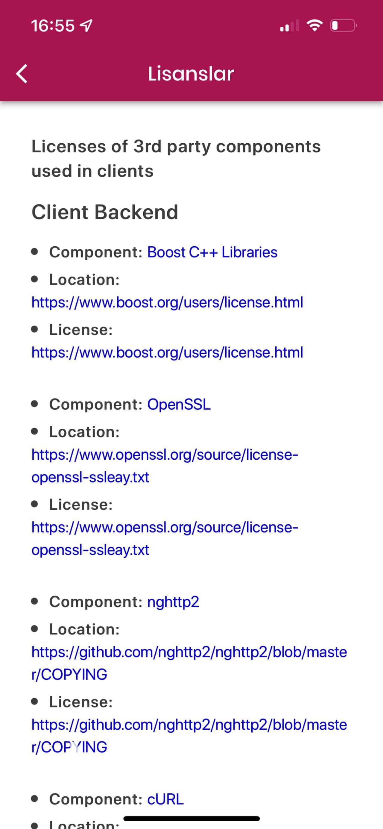 Profil bölümünde Lisanslar sayfası altında uygulama içinde kullanılan tüm üçüncü taraf bileşenler liste hâlinde veriliyor. Geliştiriciler açısından, bunların listelenmesi ilginç ve memnun edici bir detay olarak nitelendirilebilir.