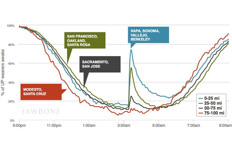 Richter ölçeğine göre 6.0 şiddetindeki deprem bölgede son 25 yılın en büyük sarsıntısı olarak kayıtlara geçmişti. Jawbone tarafından yayınlanan grafiğe bakıldığında Napa, Berkeley, Sonoma ve Vallejo gibi şehirlerde depremin çok daha şiddetli hissedildiği ve bu şehirlerde yaşayan pek çok Jawbone Up sahibinin uykusunun bölündüğü görülüyor. Yine aynı grafik sayesinde depremin Santa Cruz’da pek hissedilmediği ve bölgede yaşayanların uykusunun bölünmediği anlaşılıyor.