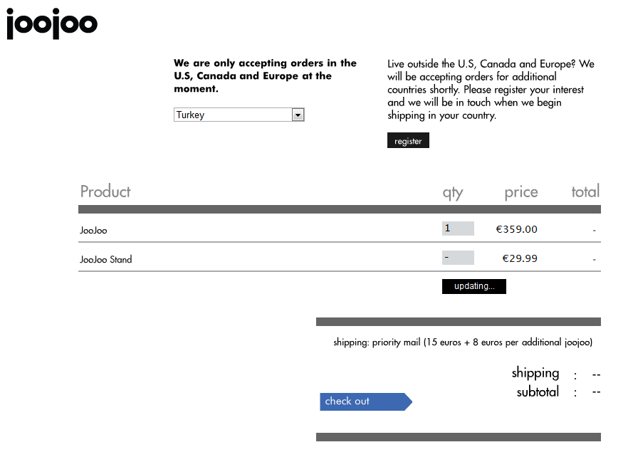 JooJoo’nun web sitesinden bu tabletin Türkiye’ye satılıp satılmayacağını kontrol ettik ve bir sürprizle karşılaştık. Evet, JooJoo için Türkiye’den de sipariş verilebiliyor. Türkiye için belirlenen satış fiyatı 359 avro. Eğer isterseniz 29.99 avro daha ödeyerek JooJoo’nun standına da sahip olabilirsiniz. Bu arada 15 avro’luk kargo ücreti de siparişe ekleniyor. Yani, standıyla birlikte JooJoo almak isteseniz ödeyeceğiniz toplam miktar 403.99 avro olacak. JooJoo’yu satın alan kullanıcılar bazı eksikliklerden yakınıyordu. Fusion Garage’ın başındaki isim olan Chandra Rathakrishnan da sağlam bir yazılım güncellemesiyle bu eksikliklerin ve sorunların önüne geçileceği konusunda söz vermişti. Ürün için sipariş verip gelmesini bekleyene kadar yeni yazılım güncellemesinin de bir an önce çıkması için dua etmeye başlayabilirsiniz.