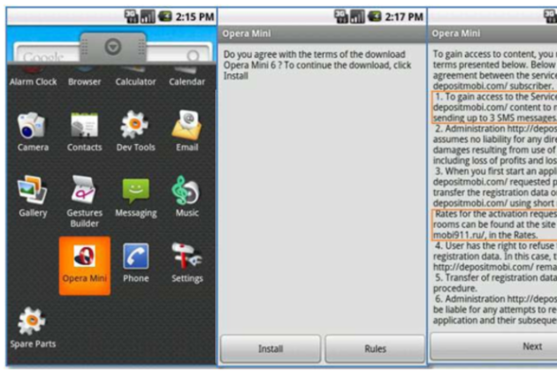 Juniper, 2010’un aksine 2011’de mobil ortamdaki zararlı yazılımların para kazanmaya odaklandığını dile getirdi. Örneğin, RootSmart gibi SMS truva atları katma değerli SMS servislerinden yüksek bir gelirin elde edilmesini sağladı. Platformlara baktığımızda Android’in popülaritesi ve açıklığıyla korsanların birinci hedefi olduğu görülüyor. Ne var ki, Android Market zararlı yazılımları yayılması hususunda tek suçlu değil. Juniper’in araştırmaları zararlı Android yazılımlarının sahte yükleyici dosyalarından, çoğunlukla gerçek Android Market uygulamalarının sahtelerinin yer aldığı üçüncü parti mağazalardan geldiğini belirtiyor. Yukarıdaki fotoğrafta yer alan sahte Opera Mini yükleyici dosyasında görüldüğü gibi, kullanıcılar SMS kullanımıyla uygulamalar için para verilmeye itiliyor, gelecekteki kötüye kullanımlar için kapı açılıyor.