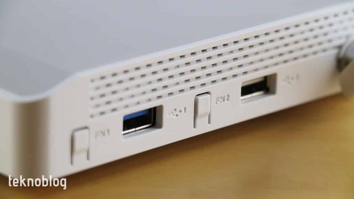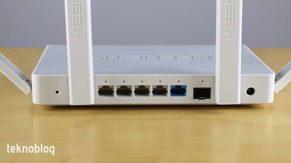 Arka tarafa baktığımızda her biri saniyede 1 Gigabit bağlantı destekleyen toplam beş adet Ethernet portu görüyoruz. Bunlardan 4 tanesi RJ-45, bir tanesi ise birleştirilmiş RJ-45 ve SFP biçiminde. İkinci port, fiber internet servis sağlayıcınızın evinize getirdiği kabloyu doğrudan Keenetic Giga’ya bağlamanıza izin veriyor. Evinize gereken kablo RJ-45 uçluysa 0 portuna takabilirsiniz. Doğrudan fiber kablosu geliyorsa, SFP portuna bağlayabilirsiniz. Bu kombo port aynı anda sadece tek bir kablo bağlamaya izin veriyor.