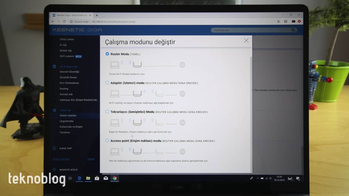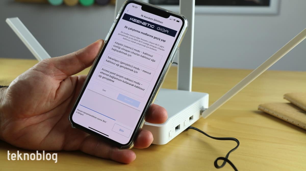 Kurulum işlemini Keenetic iOS veya Android uygulaması üzerinden hızlı şekilde başlatabilirsiniz. Cihazın kurulumu varsayılan olarak Router modu üzerinden gerçekleştiriliyor. Başlamadan önce kablo bağlantılarını düzgün şekilde yaptığınızdan emin olmalısınız. Eğer Giga’yı router olarak değil de, bir erişim noktası veya benzer işlevde kullanmak istiyorsanız, Keenetic uygulaması üzerinden çalışma modu değiştirme işlemini gerçekleştirebilirsiniz. Aynı değişiklik işlemini daha sonra Keenetic Web arayüzü üzerinde bulunan yönetim bölümünden de yapabilirsiniz.