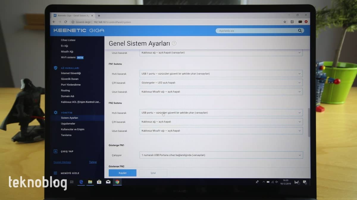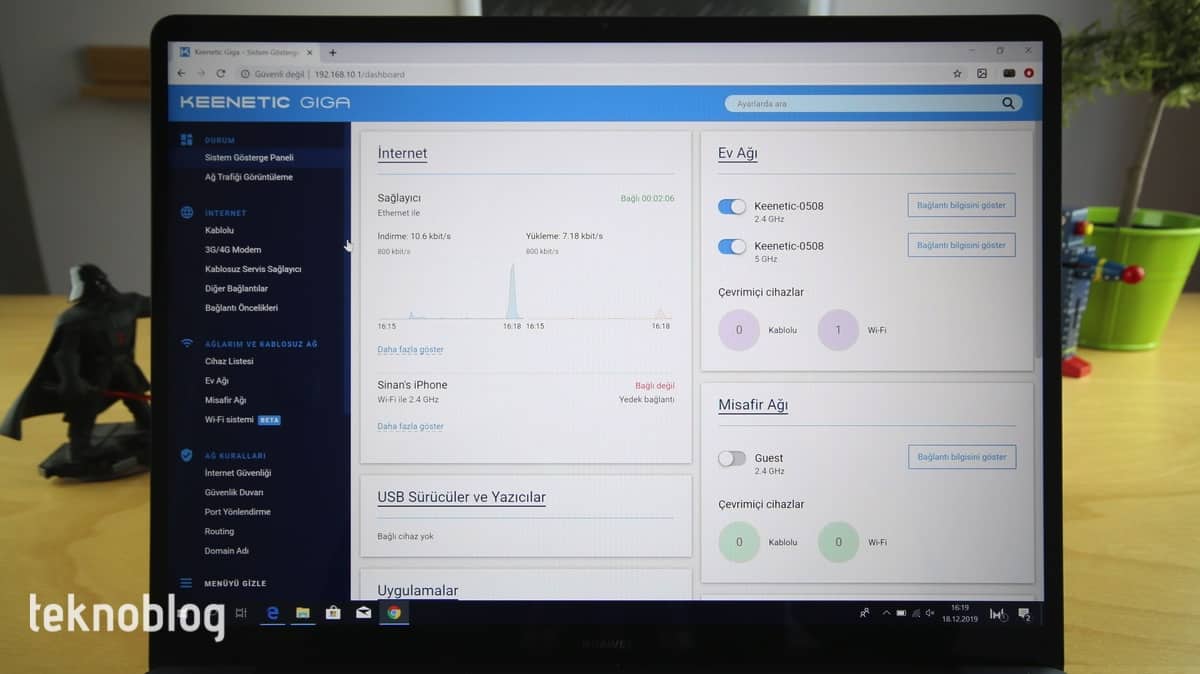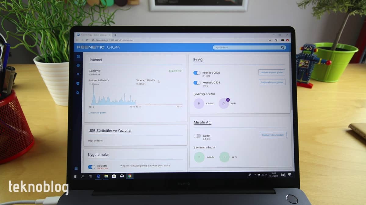 Keenetic Giga’nın ilk kurulumunu mobil uygulama üzerinden tamamladıktan sonra daha fazla ayarı Keenetic Web arayüzünden gerçekleştirebilirsiniz. Web arayüzü oldukça anlaşılır ve düzenli bir tasarımla sunuluyor. Başlangıç sayfasında ağ durumu, kablosuz ağ bilgileri, ağ trafiğinin durumunu gözleme gibi işlemleri gerçekleştirebilirsiniz. Keenetic Giga’ya bağlı cihazları kaydederek her bir cihazın ağ trafiğini detaylı şekilde takip etmek mümkün. Cihaz bazında engelleme getirme, belirli cihazların ağa erişebileceği zamanları belirleme gibi ayarlar da mevcut.
