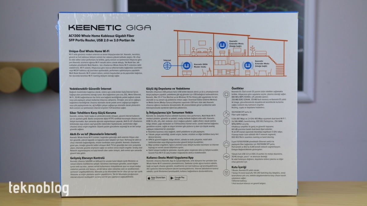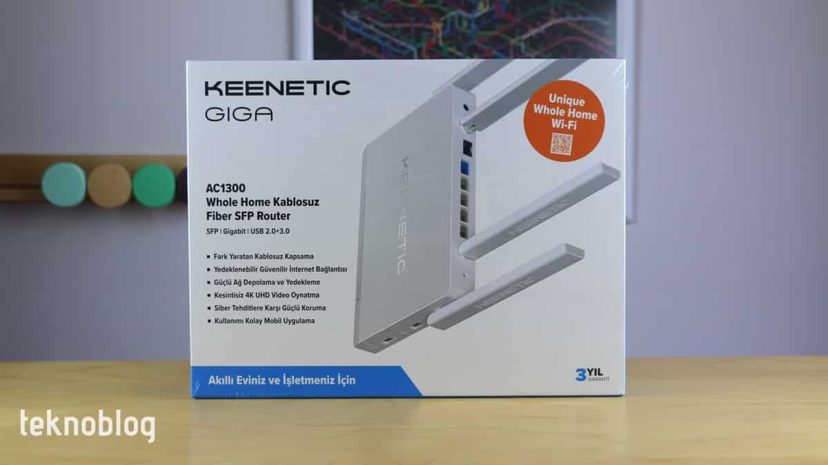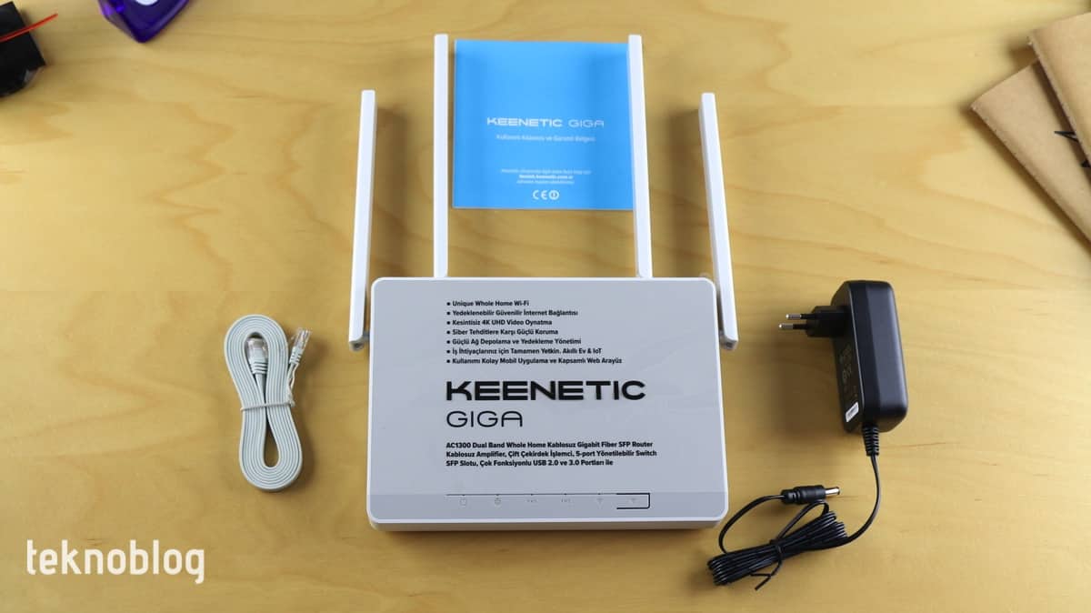 Keenetic Giga’nın kutusu da oldukça bilgilendirici bir arka yüz tasarımına sahip. Bu sayede ağ cihazının temel özelliklerini ve işlevlerini görebilirsiniz. Kutunun içinden Giga’nın yanı sıra bir adet güç adaptörü ve bir adet de Ethernet kablosu çıkıyor. Bunun yanı sıra hızlı başlangıç kılavuzu da mevcut.