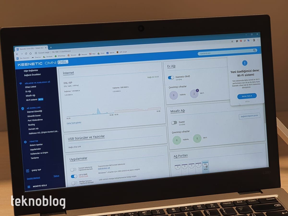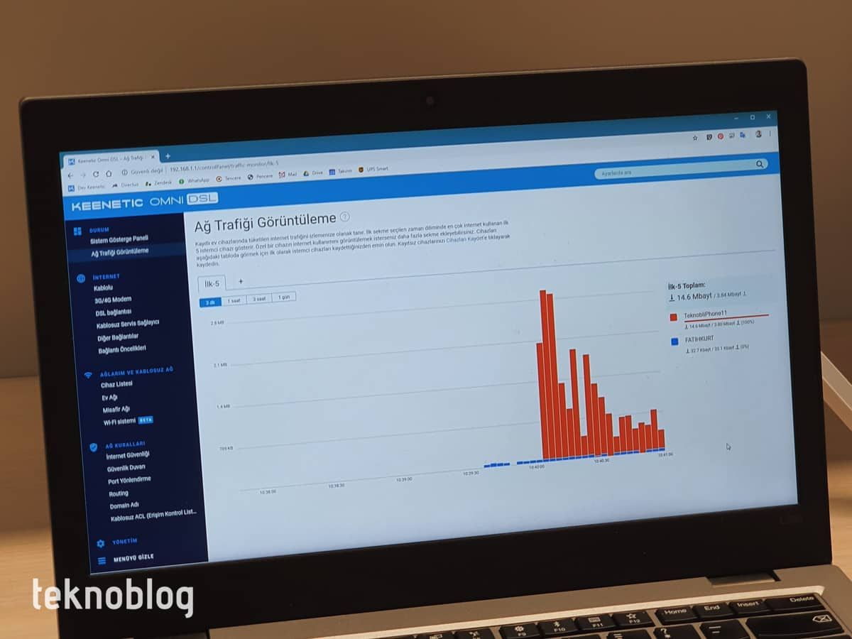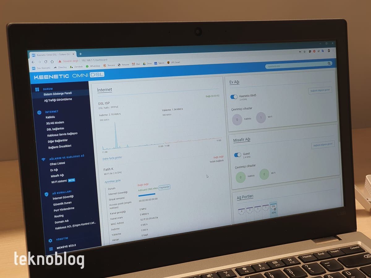 Keenetic mobil uygulaması ile modem cihazınızın durumunu görebilir ve temel seviyede bazı ayarları yapabilirsiniz. Web arayüzü ise çok daha fazla detay ve kontrol sunuyor. Web arayüzünün ana sayfasında cihazınızla ilgili temel bağlantı bilgilerini görebilir, ağ trafiğinin bir özetini görebilirsiniz. Hangi portların kullanımda olduğunu, Wi-Fi ağının durumunu, misafir ağ erişiminin açık olup olmadığını da özet niteliğindeki ana sayfada görebilirsiniz.