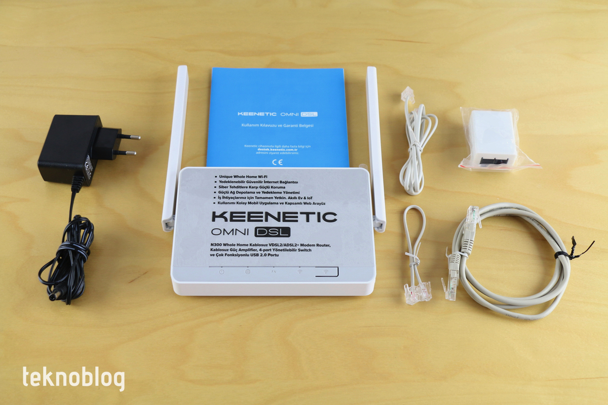 Keenetic Omni DSL de, daha önce incelediğimiz Keenetic ürünlerine benzer bir kutuda geliyor. Biraz daha küçük boyutlardaki kutunun arkasında yine doyurucu nitelikte bilgiler bulunuyor. Omni DSL’in hangi özelliklere sahip olduğunu, işinizde size ne gibi avantajlar sunacağını, siber tehditlere karşı nasıl koruma sunduğunu arkadaki açıklamaları okuyarak anlayabilirsiniz. Kutu içeriği de Extra DSL’inkiyle aynı. Bir adet Keenetic Omni DSL modem/router cihazının yanında güç adaptörü, DSL splitter, iki adet telefon kablosu, bir adet Ethernet kablosu, hızlı kurulum kılavuzu ve garanti kartı çıkıyor.