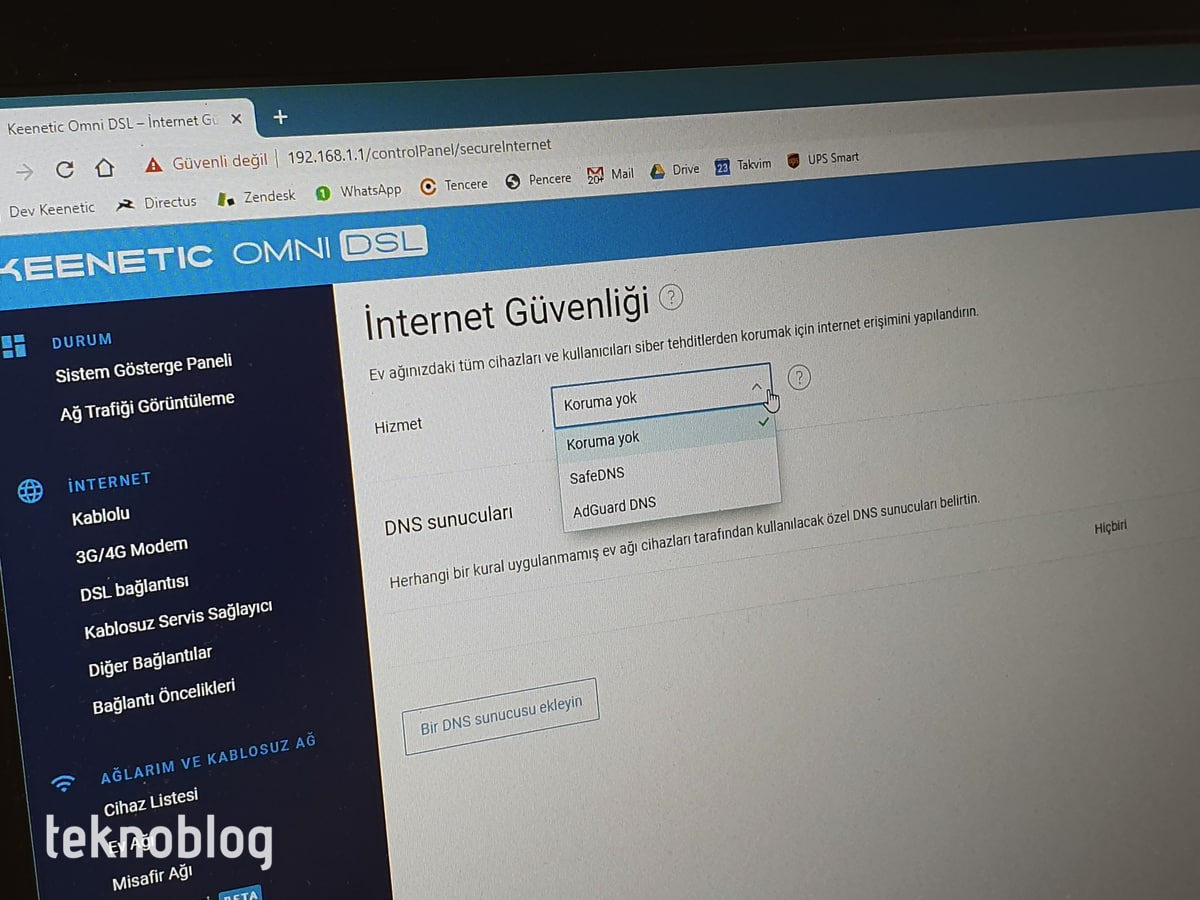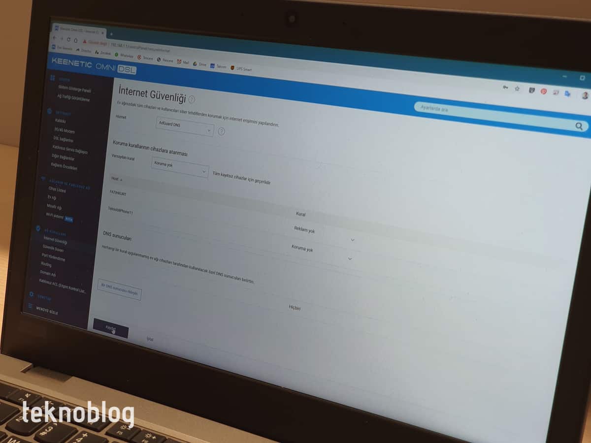 Güvenlik tarafında Omni DSL, diğer Keenetic ürünlerinden başka noktalarda da geri kalmıyor. SafeDNS gibi DNS servislerine sunulan dahili destek sayesinde internet erişimini hızlandırmak ve daha da güvenli hâle getirmek mümkün oluyor. Ayrıca internette gezinirken reklamları görmek istemiyorsanız, AdGuard dahili reklam engelleyicisi de Omni DSL’de mevcut. Cihaz bazında düzenleme yapabilir, böylelikle sadece istediğiniz cihazlarda reklam gösterimini engelleyebilirsiniz. Eğer çocuklarınızın reklamları görmesini istemiyorsanız, AdGuard desteği sizin için epey kullanışlı olacaktır.