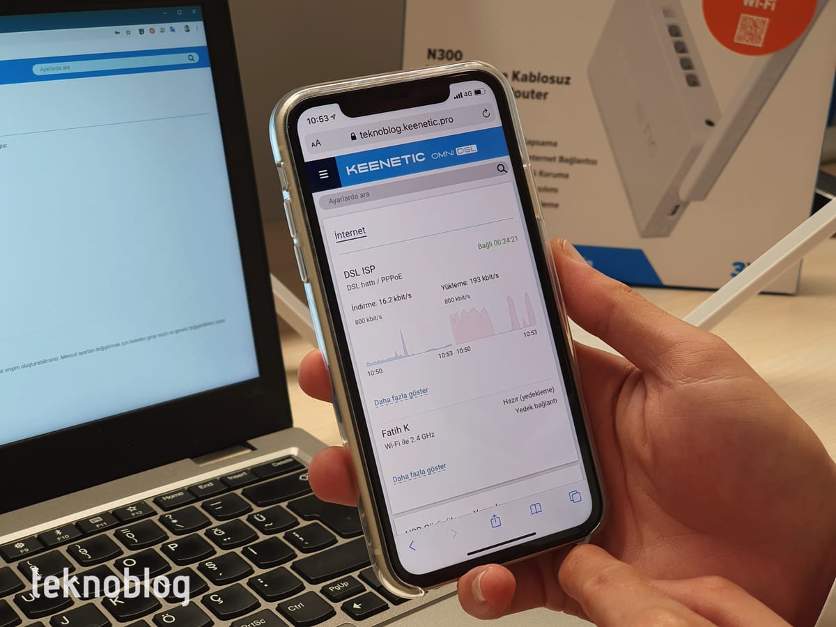 Cihazın tüm bağlantılarını yapıp kuruluma geçmeye sıra geldiğinizde önünüzde iki seçenek var. İster bilgisayarınızı isterseniz akıllı telefonunuzu kullanabilirsiniz. Akıllı telefonla kurulum biraz daha pratik görünüyor. iPhone veya Android telefonunuza ücretsiz olarak sunulan Keenetic uygulamasını kurun ve daha sonra uygulamayı açın. Omni DSL’in altında bulunan barkodu uygulamaya okutup telefonunuzu yeni cihazınızın Wi-Fi şebekesine bağlayın. Sonrasında hızlı kurulum sihirbazını kullanarak bağlantınız için gerekli bilgileri girerek işlemleri tamamlayın. Tüm bunlar beş dakikadan az bir süre içinde gerçekleşiyor ve artık Keenetic Omni DSL ile internete erişmeye başlıyorsunuz.