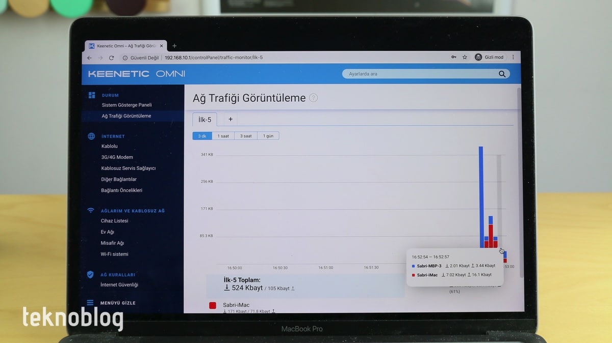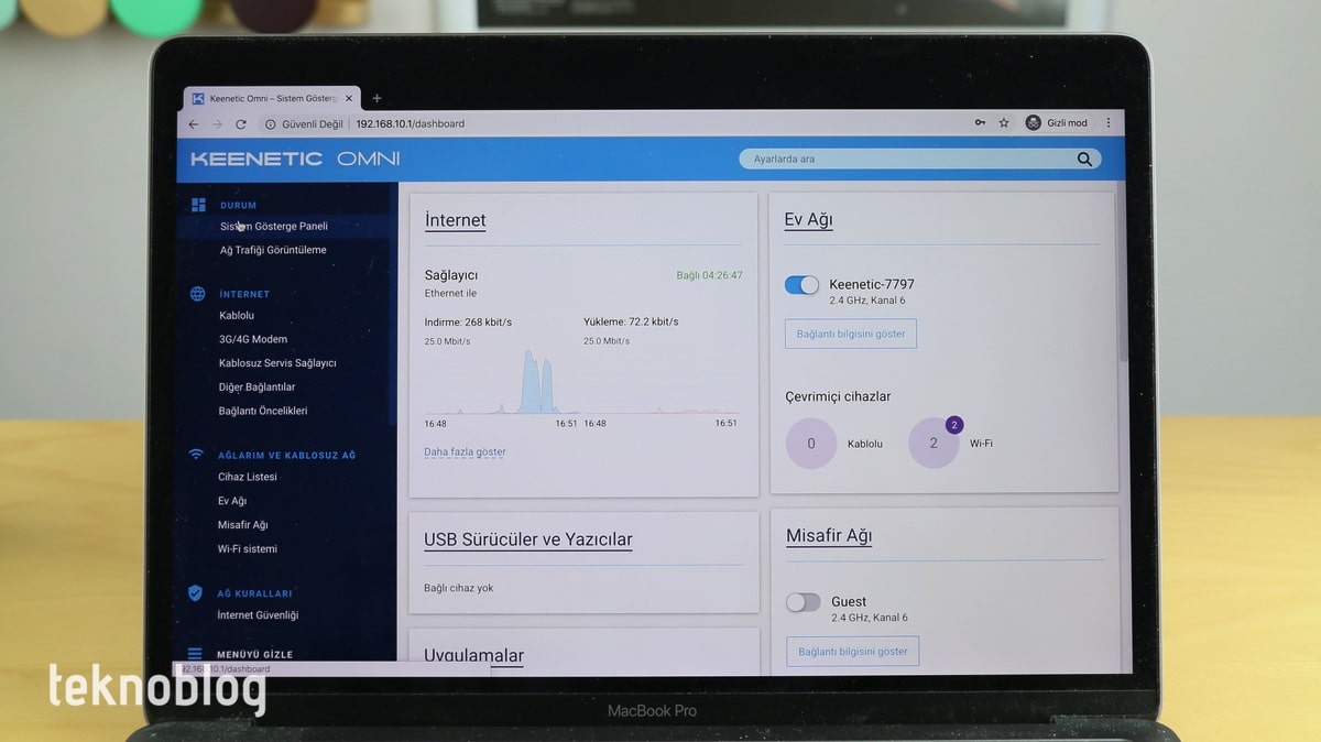 Eğer internet servis sağlayıcınız imkan tanıyorsa, Keenetic Omni’yi fiber internet bağlantınızı doğrudan dağıtmak için de kullanabilirsiniz. Üstelik MAC adresini operatörün verdiği cihazın adresiyle eşleştirme imkanı bu noktada esneklik sağlıyor. Ancak operatörünüzün verdiği cihazı fiber internet bağlantısı için kullanmak zorundaysanız, bu durumda Keenetic Omni’yi onun yanında işlev gören bir ağ cihazı olarak konumlandırabilirsiniz. Bunun için Omni’nin arkasındaki mavi renkli porta Ethernet kablosu üzerinden bağlantı sağlamalısınız. Daha sonra da gerekli ayarları Omni’nin web arayüzünde buluna Ev Ağı bölümünden kolaylıkla yapabilirsiniz.