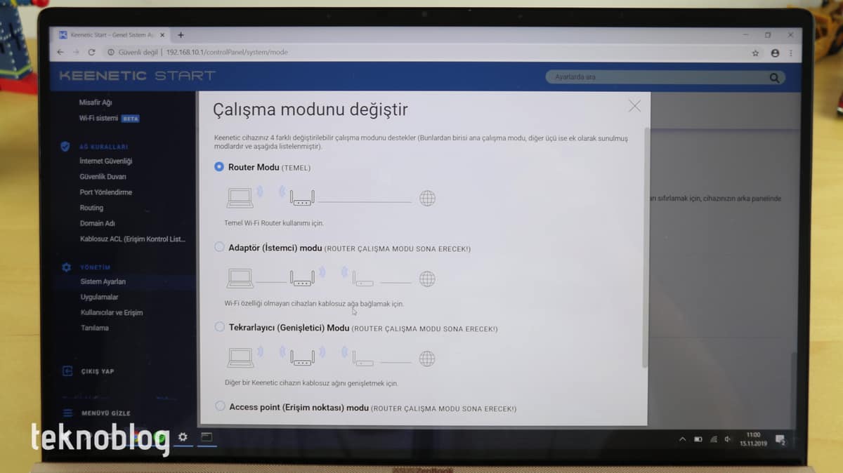 Keenetic Start açılışta router modunda başlıyor. Ancak kurulumun hemen başında çalışma modunu değiştirebilirsiniz. Eğer Start ile mevcut Wi-Fi şebekenizi kablosuz bağlantı üzerinden genişletmek istiyorsanız, o hâlde buradan Tekrarlayıcı moduna moduna geçiş yapmalısınız. Bunun ardından cihaz yeniden başlatılacaktır. Daha sonra Keenetic Start?a bilgisayarınız aracılığıyla, Ethernet portu üzerinden bağlanmalı, gerekli IP ayarlarını yapmalısınız. Keenetic Start, modu değiştirdiğinizde hangi IP değerlerini atamanız konusunda size yol gösteriyor. Daha sonra internet tarayıcısı üzerinden web arayüzüne erişebilir, cihazın evinizde veya iş yerinizdeki mevcut Wi-Fi ağına bağlantısını gerçekleştirebilirsiniz.