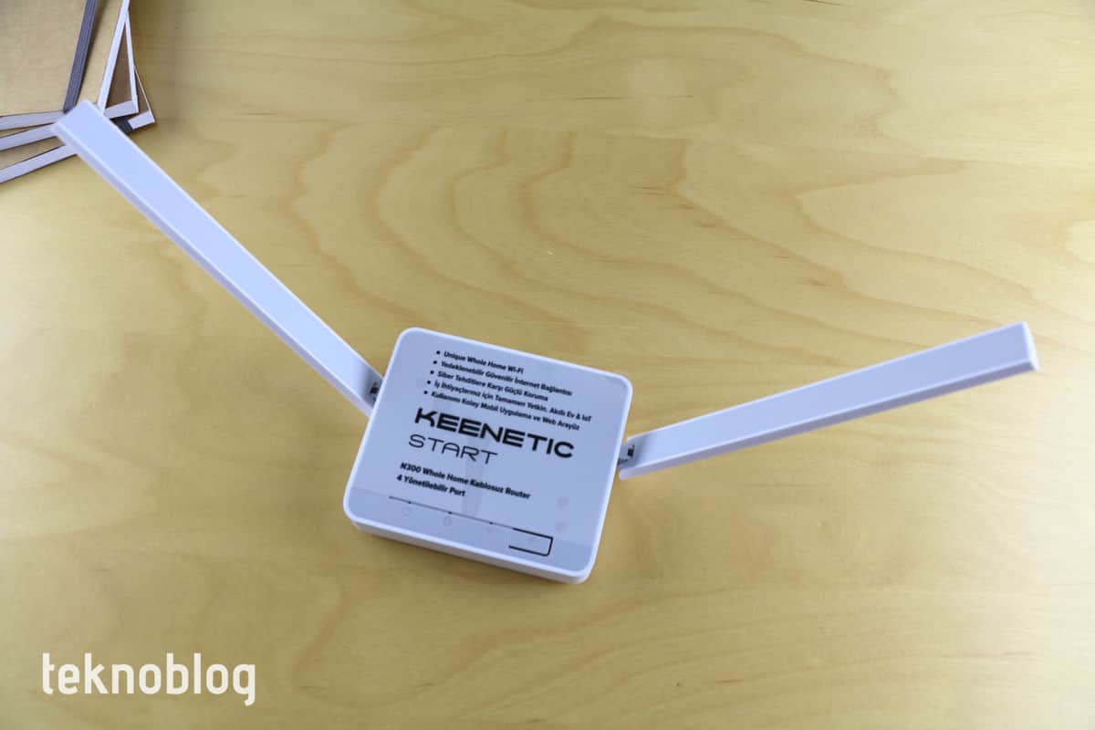 İki adet, 5dBi, yüksek hassasiyetli Wi-Fi anten, döndürülebilir yapısı sayesinde sinyal akışını ayarlamaya izin veriyor. Aynı zamanda Keenetic Start’ı yerleştirme konusunda da size daha fazla hareket imkanı tanıyor. Bunun dışında, Keenetic Start’ın tasarımı diğer Keenetic ürünlerinin tasarımına benziyor. Daha önce incelediğimiz Keenetic ürünlerine göre çok daha küçük boyutlarda geldiğini söylememiz gerekiyor. Keenetic Start, kompakt tasarımı sayesinde dar alanlara bile rahatlıkla yerleştirilebilir.