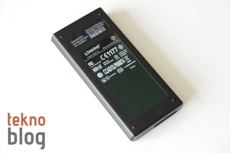 124,8 x 59,9 x 16,65 mm.’lik boyutlarıyla Kingston MobileLite iPhone 5s ile hemen hemen aynı yüzey alanına sahip. Tabii, kalınlık bakımından onun neredeyse iki katı kadar bir kalınlık söz konusu. Aygıt elinizdeyken nispeten büyük hacme karşın epey hafif olduğunu hissedeceksiniz. Zaten 98 gr. ağırlık değeri de kağıt üstünde bile hafifliği ortaya koyuyor. Plastikten yapılmış olmasının da bu hafiflikte rolü bulunuyor. Cihazın gövdesi genel olarak siyah renge sahip, sadece üst yüzeyin beşte dörtlük alanı gümüş renkli bir plakayla kaplanmış. Bunun üstünde MobileLite Wireless logosunu görüyoruz.