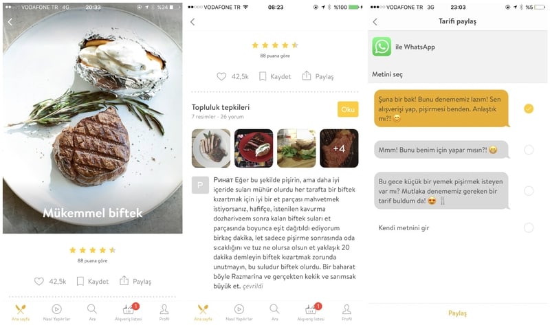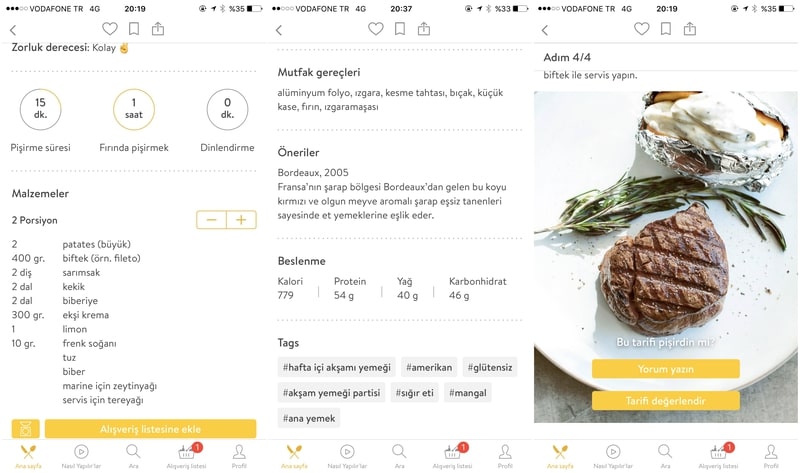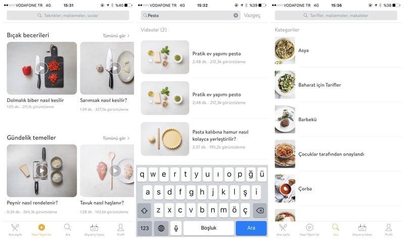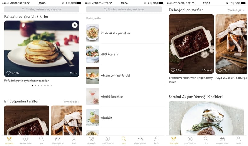 Uygulamada alt bölümde Ana sayfa, Nasıl Yapılır’lar, Ara, Alışveriş listesi ve Profil gibi bölümler yer alıyor. Ana sayfa bölümünde sizi ilk olarak kahvaltı ve brunch için dikkat çekici tariflerden oluşan bir galeri karşılıyor. Hemen altında bir çok lezzetli tarif muhteşem fotoğraflar ile “En Beğenilen Tarifler, Samimi Akşam Yemeği Klasikleri, Pratik Tavuk Yemekleri, Hafta İçinde Makarna, Tatlı Sevenlere, Asya Esintileri, Etsiz Ana Yemekler, Favori Vegan Yemekler, Smoothie ve Daha Fazlası, Vazgeçilmeyen Deniz Mahsulleri, Her Kutlamaya Uygun Kekler, Doyurucu Çorbalar” başlıkları ile belirlenmiş kategoriler yer alıyor. İlginizi çeken başlık altından tüm tariflere bakacağınız gibi, üst menüde yer alan arama çubuğundan da dilediğiniz tarifi arayabilirsiniz.