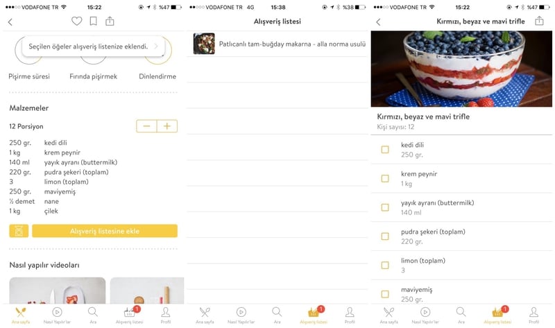 Uygulamada kullanıcılar için bir de “Alışveriş listesi” bölümü yer alıyor. Beğendiğiniz bir yemek tarifinin “Malzemeler” bölümü altında “Alışveriş listesine ekle” bölümüne tıkladığınızda, tarifin tüm malzemeleri alışveriş listenize ekleniyor. Bu, uygulamanın en güzel yanlarından bir tanesi. Bu sayede alışverişe çıktığınızda malzemeleri unutmak gibi bir derdiniz kalmıyor. Listedeki malzemeleri tamamladığınızda ise, “Listeden sil” seçeneğini tıklayarak alışveriş listenizi güncelleyebilirsiniz.
