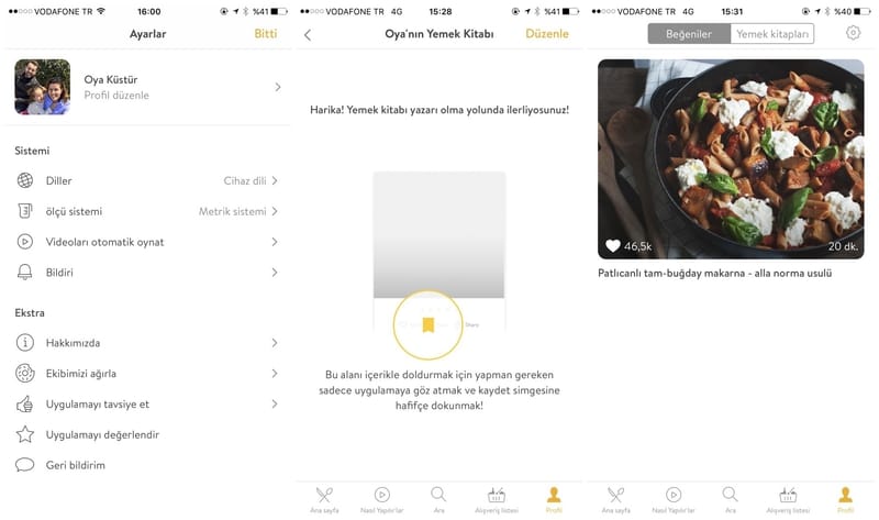 Alt menüde yer alan son bölüm ise Profil kısmı. Bu bölümde sevdiğiniz yemeklerden oluşan tariflerinizi yemek kitabı olarak saklayabilirsiniz. Ya da favori olarak seçtiğiniz tarifleri Beğeniler bölümü altında biriktirebilirsiniz. Ancak bunları yapmak için uygulamaya giriş yapmanız şart. Uygulamaya Facebook veya E-posta ile giriş yapabiliyorsunuz. Ayrıca kullanıcılara, bu bölüm altında dil, ölçü sistemi, bildirimler gibi özellikleri sonradan da değiştirme imkanı veriliyor.