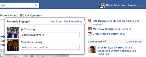 Facebook; bundan böyle nişan ve evlilik haberlerinin haber kaynağının sağ üst kısmında yer alan, doğumgünü ve etkinliklerin gösterildiği kutudan duyurulacağını açıkladı. Düğün ve nişan gibi önemli olayların bu şekilde gösterilmesi