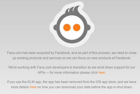 Facebook tarafından satın alınan Face.com, bunun duyurusu yapıldığı sırada yazılımcılara verilen desteğin süreceği garantisinde bulunmuştu. Ne var ki, işler artık bu şekilde yürümüyor. Yazılımcılara bir e-posta mesajı gönderen Face.com, Facebook