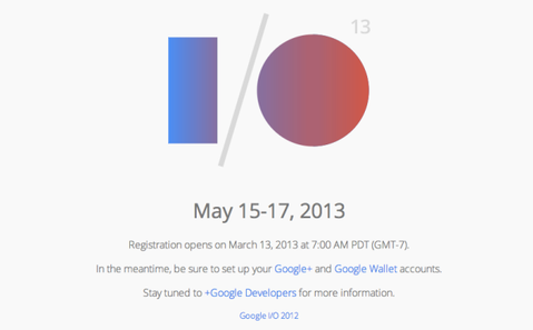 Google, bu yıl 15-17 Mayıs 2013 tarihleri arasında gerçekleştireceği I/O konferansı için kayıtları almaya başlıyor. Google I/O'nun resmi web sitesinde paylaşılan bilgiye göre resmi kayıtlar 13 Mart günü TSİ 17:00'de