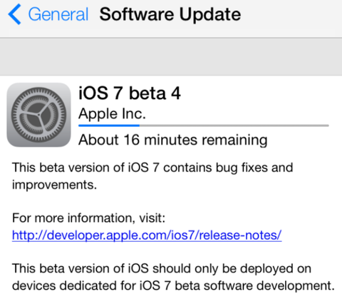 Apple, üçüncü beta sürümünü yayınladıktan üç hafta sonra iOS 7'nin dördüncü beta sürümünü yayınladı. iPhone ve iPad için yayınlanan iOS 7 beta 4, iOS 7'nin önceki beta sürümlerinin yüklü olduğu
