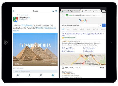 Apple'ın iOS 9 ile birlikte sunduğu çoklu görev odaklı yeniliklerden birisi de, iPad ekranının bir kısmında internet tarayıcısını bir kısmında ise başka bir uygulamayı çalıştırmaya izin veren Split View özelliğiydi. Google