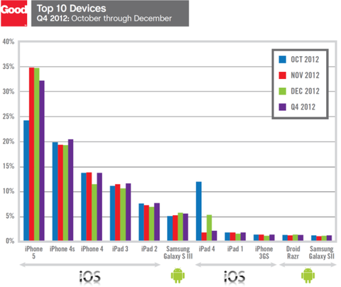 Üreticilerin kurumsal müşterileri kazanmak için gösterdiği büyük çabaya rağmen, yayınlanan yeni bir rapor 2012'nin son çeyreğinde Android'in kurumsal pazardaki payının gerilediğini gösteriyor. Good Technology tarafından yayınlanan Cihaz Aktivasyon Raporu'na göre,