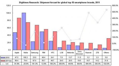 Apple, iPhone'un dünya genelindeki popülaritesi sayesinde akıllı telefon pazarında her geçen gün daha da güçlü hâle geliyor. 2011'in ikinci çeyreğinde Nokia'yı geçerek dünyanın piyasa en çok cihaz süren akıllı telefon
