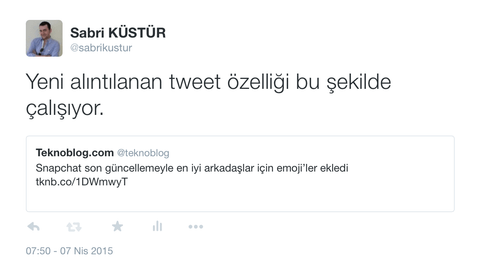 Twitter alıntılanan tweet'ler işleviyle ile ilgili bir değişiklik yaptığını duyurdu. iPhone ve web kullanıcıları için yayınlanan güncellemeyle birlikte alıntılanan tweet'ler özelliğini kullanırken sadece yazı şeklinde alıntılama yapmak yerine tweet'in orijinalini