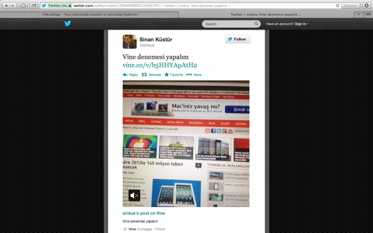 Twitter'ın dün yayınladığı Vine uygulaması sayesinde tweetlerin içine 6 saniyelik kısa videolar yerleştirmek mümkün hale gelmiş durumda. Ancak tweetlere yerleştirilen bu videoların izlenmesinde resmi uygulamaların sağladığı pürüzsüz deneyimi üçüncü taraf