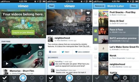 Vimeo, güncellediği iPhone uygulaması ile kullanıcılarına telefon üstünden video çekme ve yükleme imkanını sunuyor. Daha önce çekilmiş videolar da yine uygulama üstünden Vimeo'ya yüklenebiliyor. Uygulamada kullanılan sekme tabanlı arayüz gezinmeyi