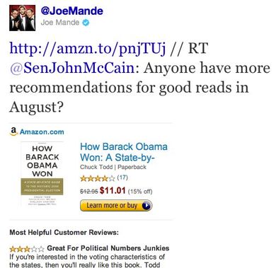 Twitter, Amazon ve iTunes içerik bağlantılarını da sunmuş olduğu ön izleme görünümü kapsamında sitesine eklemeye başladı. Eğer bir tweet'te Amazon veya iTunes'a doğru yönlendirilmiş bir bağlantı bulunuyorsa, daha önce YouTube,