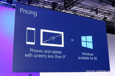 Microsoft ekran boyutu 9 inç'ten küçük olan telefon ve tabletler için Windows'u ücretsiz hâle getireceğini açıkladı. Şirket bu yolla işletim sisteminin pazar payını artırmayı hedefliyor. Microsoft'un Windows Phone ve Windows