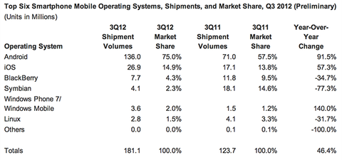 2012'nin ikinci çeyreğinde satılan akıllı telefonların büyük kısmını Android işletim sistemli cihazlar oluşturmuştu. Yılın üçüncü çeyreğinde de bu durum değişmedi ve bu dönem içinde satılan akıllı telefonların yüzde 75'i Google'ın