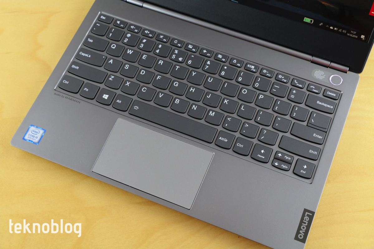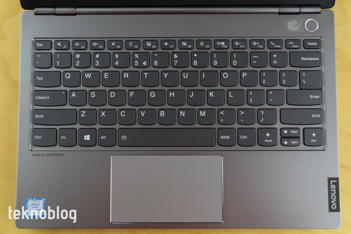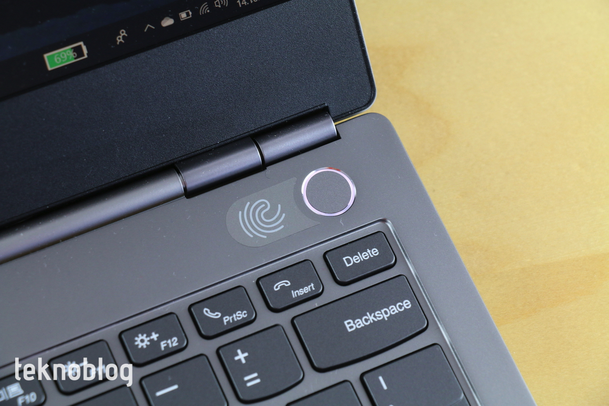ThinkBook 13s’te kimlik doğrulama yöntemi olarak parmak izi okuyucu kullanılıyor. Klavyenin sağ üst köşesinde yer alan güç butonu aynı zamanda parmak izi okuyucusunu da barındırıyor. Bu düğmenin etrafını saran bir ışık halkası var. Parmak izi okuyucunun kullanılabildiği durumlarda bu halka yeşil renkte yanıyor. Parmak izini tanıtma işlemi hızlı şekilde tamamlanıyor. İki elinizin tüm parmaklarını ekleyebilirsiniz, ancak çoğu kullanıcı için sadece tek bir işaret parmağını eklemek yeterli olacaktır.