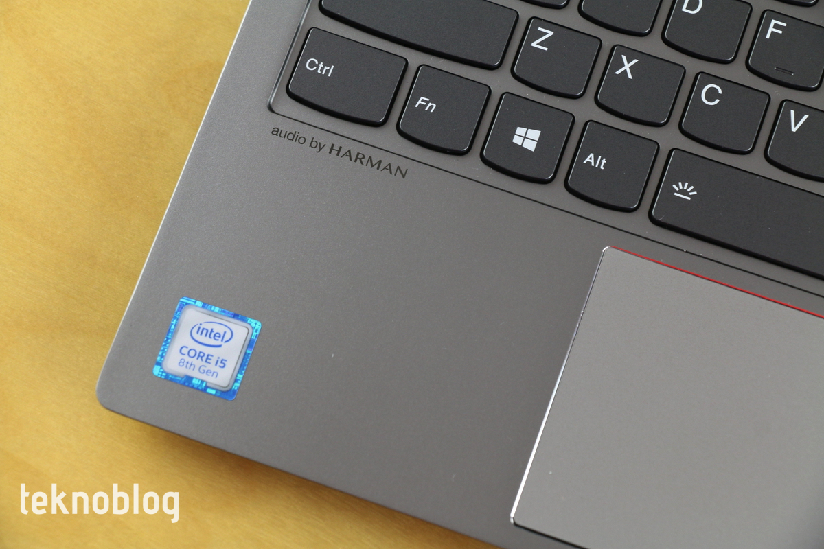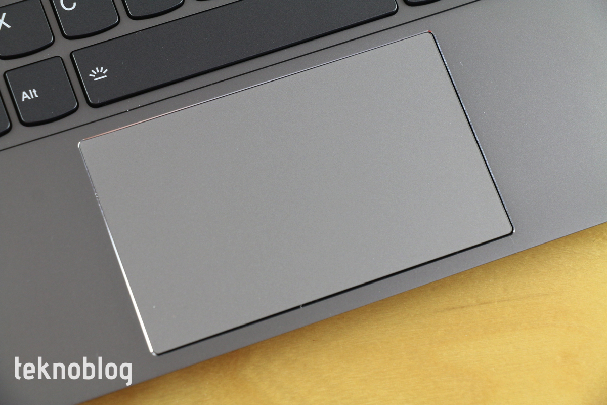 Söz izleme dörtgenine gelmişken, oradan devam edelim. Bu birimin sınırları krom çizgiyle belli ediliyor. Bu da dizüstü bilgisayara yapılmış hoş bir tasarım detayı da oluyor. Yumuşak bir yüzeye sahip olan izleme dörtgeninin tepkiselliği yüksek ve hızlı çalışıyor. Bununla birlikte sert olduğunu ve tıklamalarda biraz fazla ses çıkardığını gözlemledik. Bu nedenle biraz sıradanmış gibi bir his verdi. Ne olursa olsun, ThinkBook 13s’i deneyimlediğimiz süre boyunca herhangi bir şekilde fareye ihtiyaç duymadık. Öte yandan izleme dörtgeninin çoklu parmak desteği de gayet iyi. Windows 10 kullanıcı arayüzünü birden fazla parmakla rahat biçimde kontrol etme imkanı sunuyor.