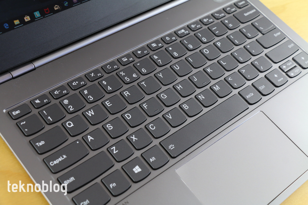 ThinkBook 13s’in klavyesi ThinkPad serisinden ödünç alınmış, ancak kırmızı renkli kontrol topu hariç. Tuşlar bir ThinkPad klavyesine göre biraz daha gevşekmiş gibi hissettiriyor. Yine de tuş derinliği, tuşlar arası mesafe iyi. Yazı yazarken fazla zorlandığımızı söyleyemeyiz. Klavyenin en üst satırı çeşitli işlevlere ayrılmış. Bunların arasında gelen Skype çağrılarını kabul etmeyi veya reddetmeyi sağlayan tuşlar da bulunuyor. Eğer fonksiyon tuşlarını kullanmak istiyorsanız, bunun için klavyenin en alt satırında bulunan Fn tuşuna basmanız gerekiyor. Bu arada klavyenin sıvı dökülmelerine karşı dayanıklı olduğunu bilmek de memnun edici. Bizim elimizdeki test örneğinin arka klavye aydınlatması yok, ancak Lenovo bunu opsiyonel olarak sunuyor.