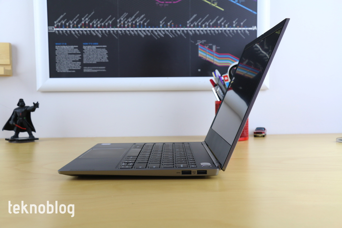 Ekran iyi bir multimedya deneyimi için yeterli, ancak keşke kullanım bakımından da Lenovo’nun “Yoga” bilgisayarlarındaki esnekliği sunsaydı. Menteşe en fazla 180 derecelik açılmaya izin veriyor. Ekranın çadır moduna veya diğer modlara almak, film ya da başka bir videoyu izlerken daha rahat etmeyi sağlayabilirdi.