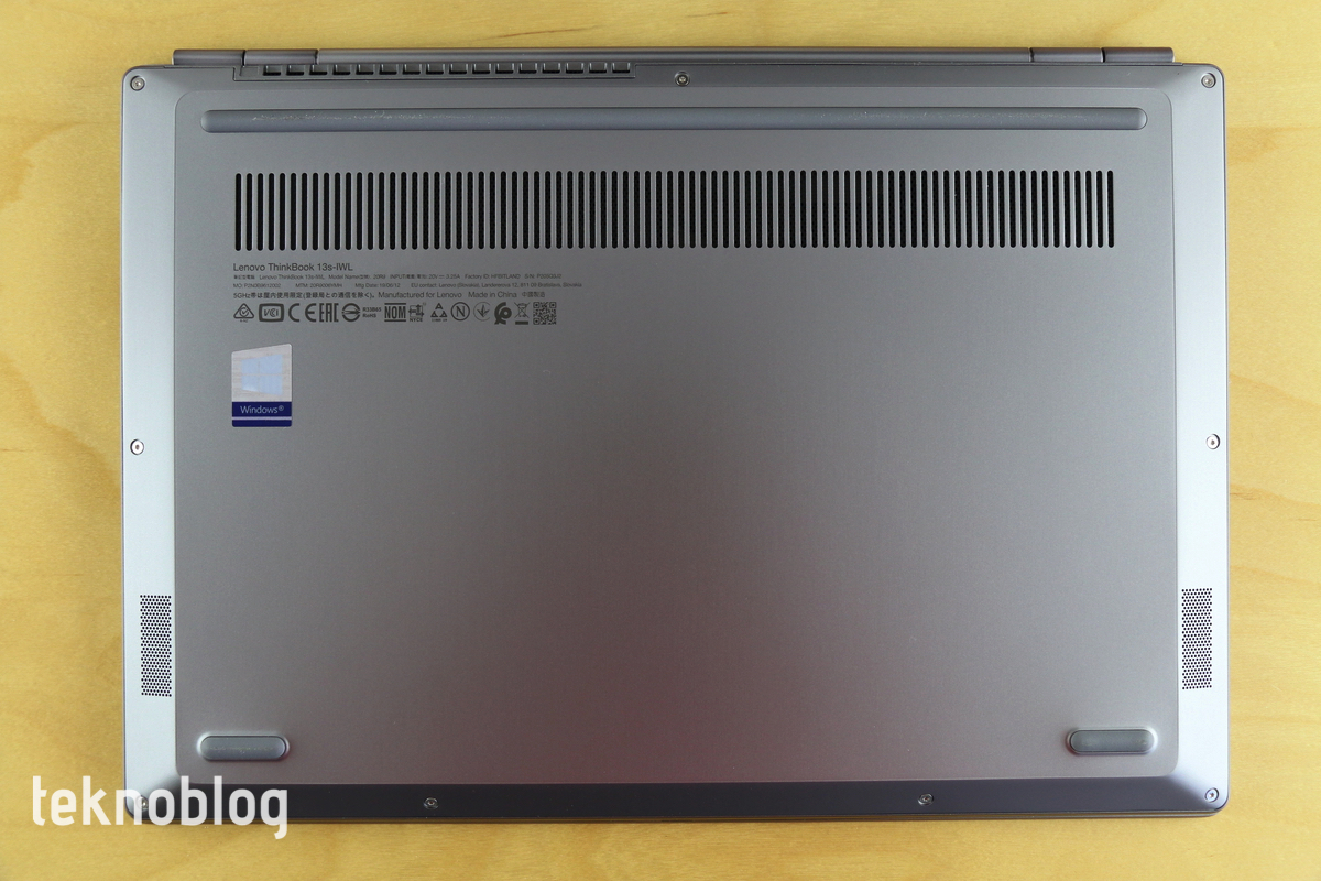 ThinkBook 13s’in tabanına baktığımızda üst tarafta tek ve uzun bir plastik tampona yer verildiğini, alt tarafta ise her iki kenara doğru yerleştirilmiş iki küçük plastik tamponun bulunduğunu görüyoruz. Ayrıca üst kenara doğru yerleştirilmiş ve küçük sayılmayacak bir havalandırma ızgarası da mevcut durumda.