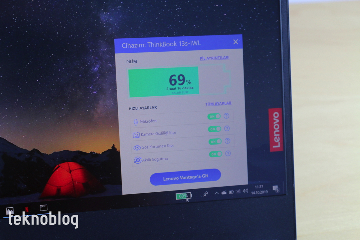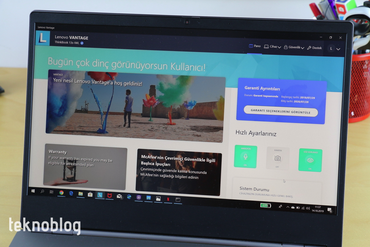 Örneğin, Lenovo Vantage uygulaması sayesinde bilgisayarın donanım durumunu ve güvenliğini görebilir, Lenovo’nun tavsiyelerini uygulayarak sistemi daha verimli hâle getirebilirsiniz. Mikrofon ve kamerayı kapatıp açma, ekrandaki göz korumasını etkinleştirme gibi işleri de Vantage üzerinden gerçekleştirebilirsiniz. Ayrıca Lenovo Vantage’ın görev çubuğuna yerleşen görsel bileşeni sayesinde kalan pil yüzdesini ve tahmini kullanım süresini de takip edebilirsiniz. Bu araç bazı gizlilik ayarlarını da hızlıca yapmaya imkan sağlaması nedeniyle epey kullanışlı oluyor. McAfee’nin güvenlik yazılımı da başlangıç süresince ücretsiz deneme olarak sunuluyor. Daha sonrasında para vererek sürekli kullanmaya karar vermek ise size kalmış.