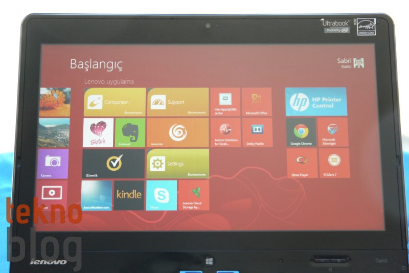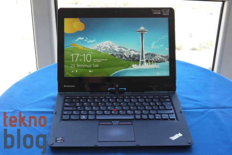 Ekranı 180 derece döndürüp klavye üzerine kapatarak bir tablet gibi de kullanabilirsiniz. Dokunmatik ekran ve Windows 8 Pro işletim sistemi bu cihazın bir tablet gibi rahatlıkla kullanılmasına izin veriyor. Ancak bir tablete göre ağır kaçan ThinkPad Twist’in bu biçimde uzun süre kullanılabileceğini pek de düşünmüyoruz. Tablet kullanımının dışında Lenovo ThinkPad Twist’i tıpkı IdeaPad Yoga 13 gibi çadır veya stand modunda kullanabilirsiniz.