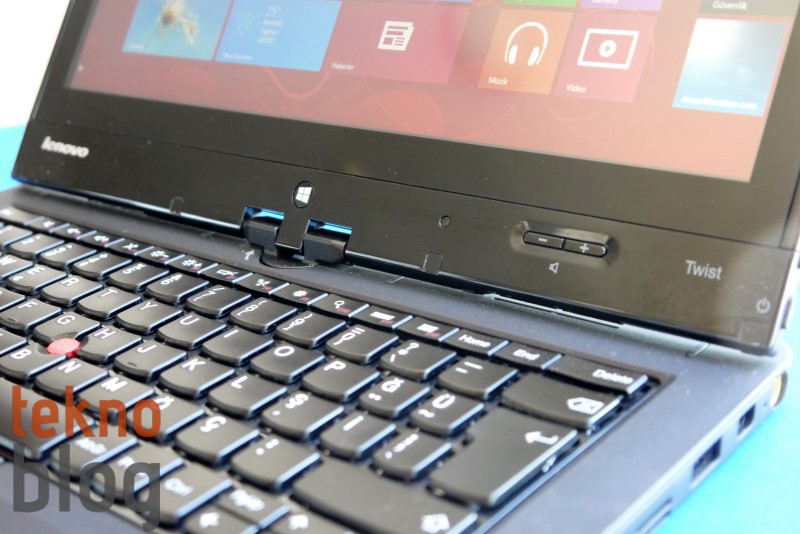 ThinkPad Twist Edge’in kapağını kaldırdığınızda karşınıza ThinkPad ailesinden alıştığınız bir düzen çıkıyor. Sağ alt köşede yer alan ThinkPad logosunda i harfinin noktasının aydınlatılmış olması ve bilgisayar çalıştığında yanması güzel bir ayrıntı olmuş. Cihazın güç ve kilit tuşları bir tablet gibi kullanım da göz önünde bulundurularak ekranın sağ kenarına yerleştirilmiş. Yine tablet gibi kullanım senaryosu dahilinde ekranın hemen altında güç butonları ve Windows tuşu yer alıyor.