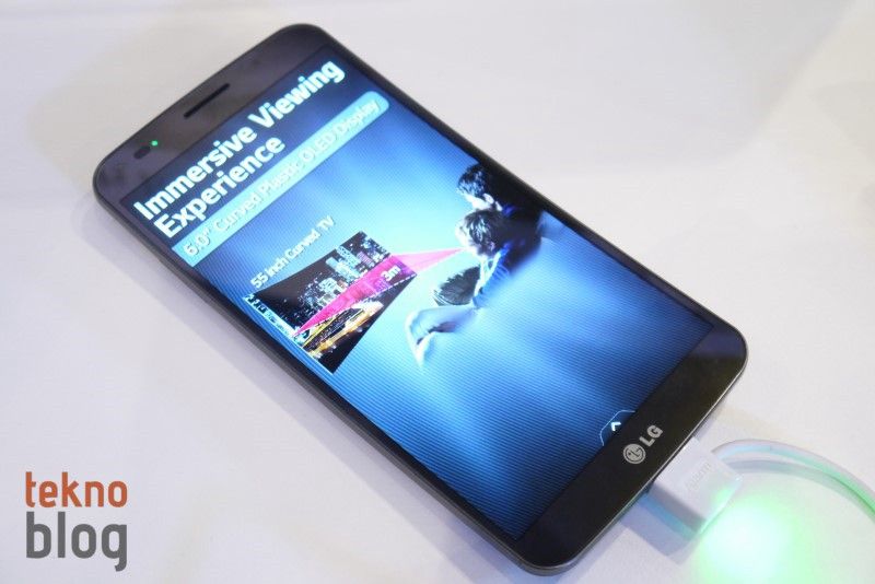 Bu Android telefonunun şüphesiz en önemli özelliği, 6 inç köşeden köşeye uzunluğa sahip ekranının kavisli bir yapıya sahip olması ve esneyebilmesi. P-OLED ekran 1280 x 720 piksel çözünürlüğe sahip. 6 inç büyüklükteki bir ekranda bu çözünürlük 245 ppi gibi bir piksel yoğunluğuna denk geliyor. Tabii ki, karşımızdaki ekranın piksel yoğunluğu Full HD çözünürlükteki bir 6 inç’lik ekranınkine göre düşük, LG G Flex’i görmeden önce bu konuda kafamızda soru işaretleri vardı. Ancak telefonun ekranını gördükten sonra bu soru işaretleri dağıldı, çünkü 720p çözünürlükte bile ekran etkileyici görünüyor, pikselleri çok farketmiyorsunuz.