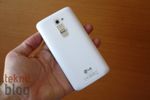 Tuşların ince profili sağlamak amacıyla arkaya alınmış olması telefonun kenarlarını tamamen boşaltmıyor. Solda microSIM kart tepsisi; altta hoparlör, 3.5 mm. kulaklık jakı, mikrofon micro USB portu yer alıyor. Üstte de kızılötesi port ve ikinci mikrofonu görüyoruz. Arka bölümde güç ve ses kademe tuşlarının dışında 13 megapiksel kamera ve LED flaşı görüyoruz. Arka kapak yerinden çıkarılmıyor, bu da telefonun bataryasının sabit olduğu anlamına geliyor. Ayrıca microSD kart yuvası da bulunmuyor. Bu da LG G2’nin dahili hafızasıyla idare etmeniz gerekeceği anlamına geliyor.