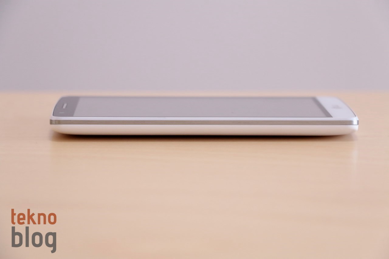 LG G3 Beat’in ekranının altında sadece LG logosu yer alırken ekranın üstünde 1.3 megapiksel ön kamera, LED durum gösterge lambası ve ahize hoparlörünü görüyoruz. İnce bir görünüm sağlamak adına kenarlarda herhangi bir tuşa, giriş veya çıkışa yer verilmiyor. LG G3 Beat’in kavisli arka yüzü sayesinde kenarlardan arka yüzeyin en orta noktasına doğru giderek kalınlaşan bir yapı söz konusu. Sonuç olarak 10.3 mm. gibi bir kalınlığa sahip olmasına rağmen LG G3 Beat daha ince görünen bir akıllı telefon.