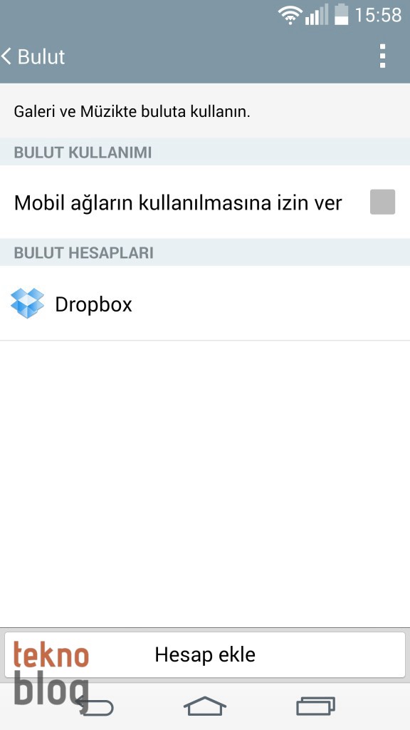 LG G3’ün dahili hafızası ve içine takılan bellek kartı yeterli gelmiyorsa, geliştirilmiş bulut depolama desteği hoşunuza gidecektir. Ayarlar altında bulunan Bulut bölümü üzerinden Dropbox veya Box.net hesaplarının tanımlanmasına izin veriliyor. Bunu yaptıktan sonra bu bulut servislerinde depoladığınız içeriklere galeri veya müzik uygulamalarından erişmeniz mümkün oluyor. Ayrıca telefondaki içerikleri bu bulut servislerindeki hesaplarınıza aktarma imkanınızda bulunuyor. Eğer LG gelecekte daha fazla bulut servisini destekler hâle gelirse, bu en gözde özelliklerden bir tanesi olabilir.